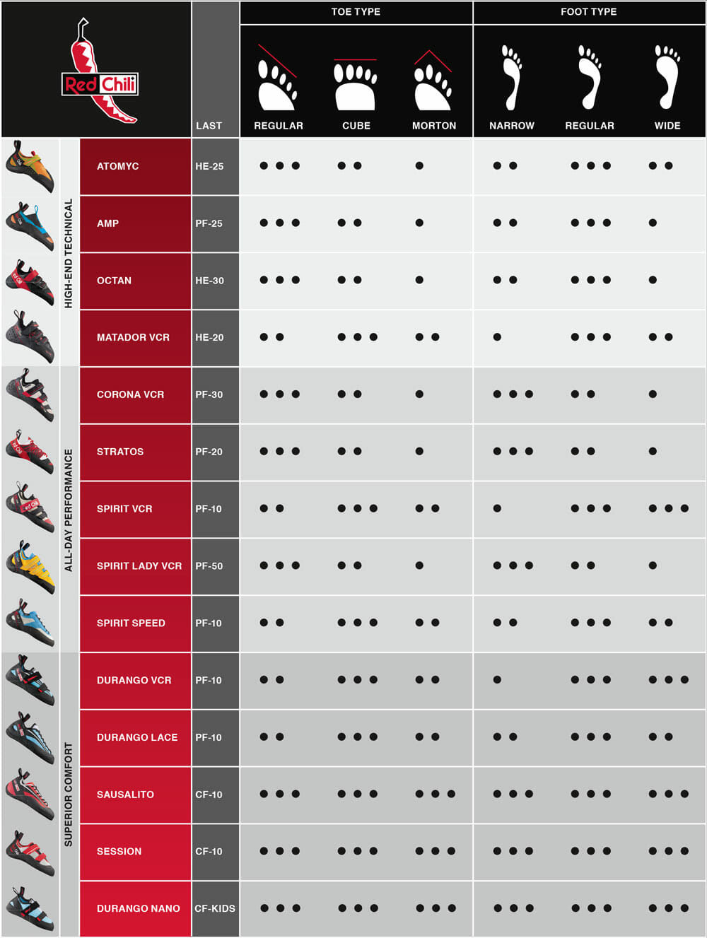 Dabei sollte erwähnt werden, dass ich in meinen Straßenschuhen ausnahmslos Größe 42 trage. Die Zehenform ist tendenziell eher ägyptisch, das heißt, der zweite Zeh ist bei mir minimal kürzer als der große Zeh. Beide Red Chili Schuhe habe ich eine ganze Nummer kleiner in Größe 41 getestet und würde sie als eher eng, den Atomyc als sehr eng bezeichnen. Das entspricht übrigens auch der Größenempfehlung vom Hersteller selbst: Für bequemes Tragen kann man den Amp eine halbe Nummer kleiner, den Atomyc in derselben Größe wie seine normalen Schuhe wählen. Klar, wer hohen Wert auf maximal präzises Antreten und viel Rückmeldung legt, muss hier dementsprechend nach unten korrigieren – mehr als eine ganze Nummer kleiner ist jedoch nicht zu empfehlen und wird schnell schmerzhaft – und das braucht’s bei einem modernen Kletterschuh nun wahrlich nicht mehr. Für welche Fuß- bzw. Zehenform die Schuhe letztlich optimal sowie weniger ideal geeignet sind, zeigt die nebenstehende Übersicht.