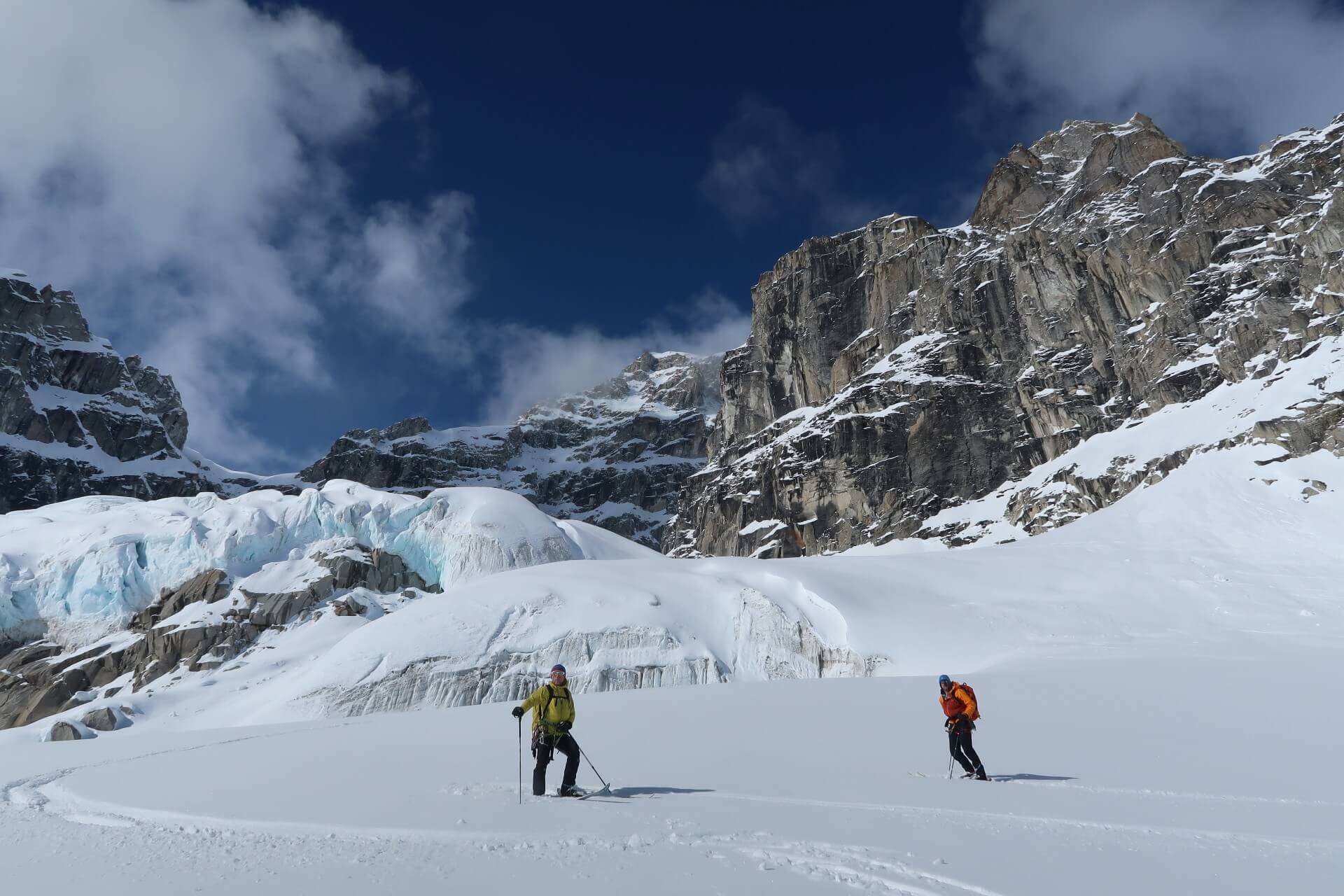 Eine Woche später, am Westgrat des Mount Dan Beard. Risse in der Schneedecke, ich begreife sofort was geschieht. Es zieht mir die Füße weg, es dreht mich. Zwischen den Schneeblöcken schieße ich auf die 500 m hohe Wand zu, die unter mir liegt. Das Unterbewusstsein gibt mir zu verstehen, dass ich sterben werde. Über mir sehe ich Martin im freien Flug, von mir mitgerissen – bis ich realisiere, dass das aufgrund meiner Seilführung nicht passiert sein kann.