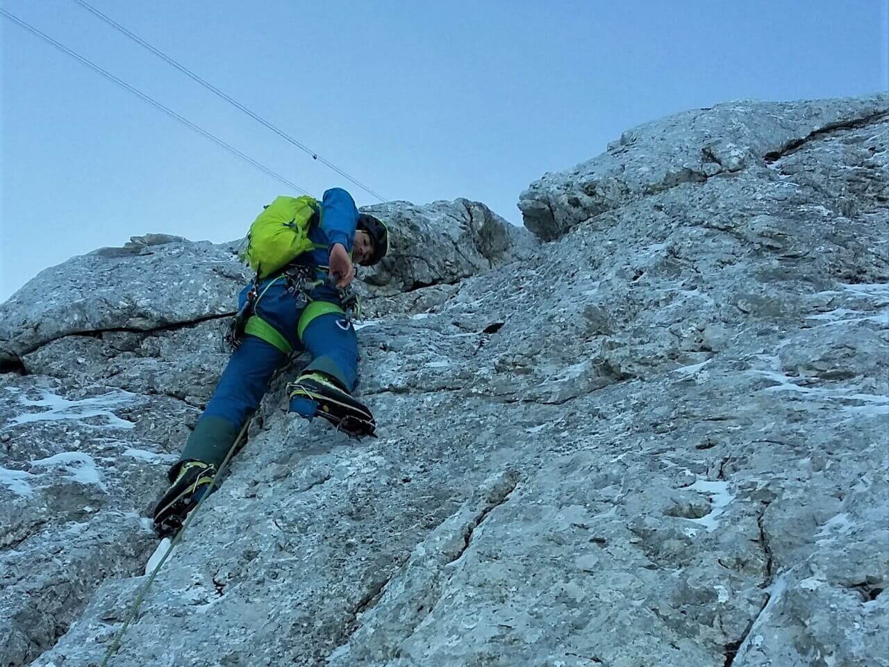 Ich checke, ob ich mich bewegen kann, greife meine Eisgeräte, klettere zitternd zurück zum Grat, um die Zeit zu nützen, bevor die Schmerzen kommen.