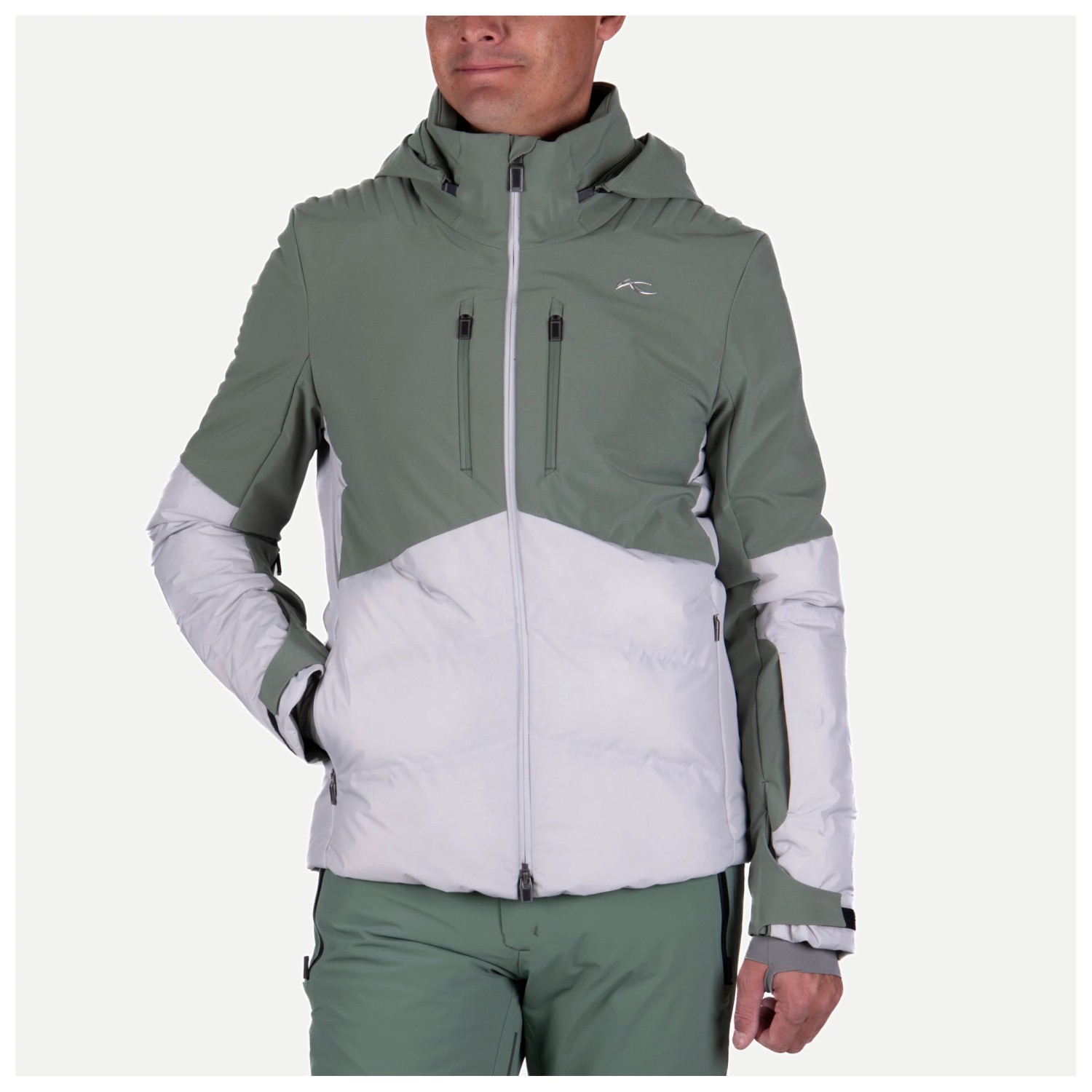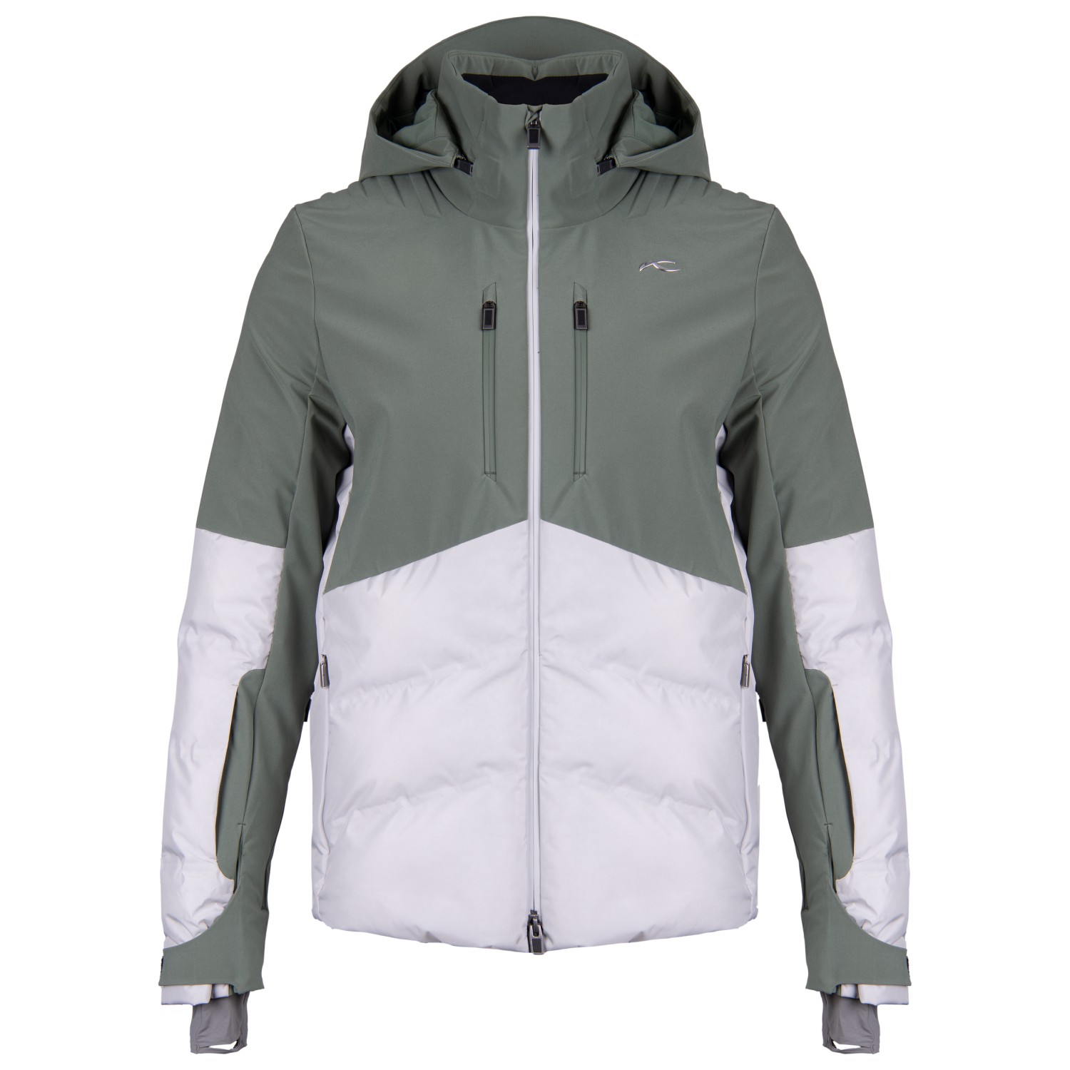 - Klettverschlüsse an den Ärmeln, Stehkragen, Jacke-Hose-Verbindungssystem, abnehmbarer Schneefang, verstellbarer Saum, vorgeformte Ärmel, integriertes Brillenputztuch