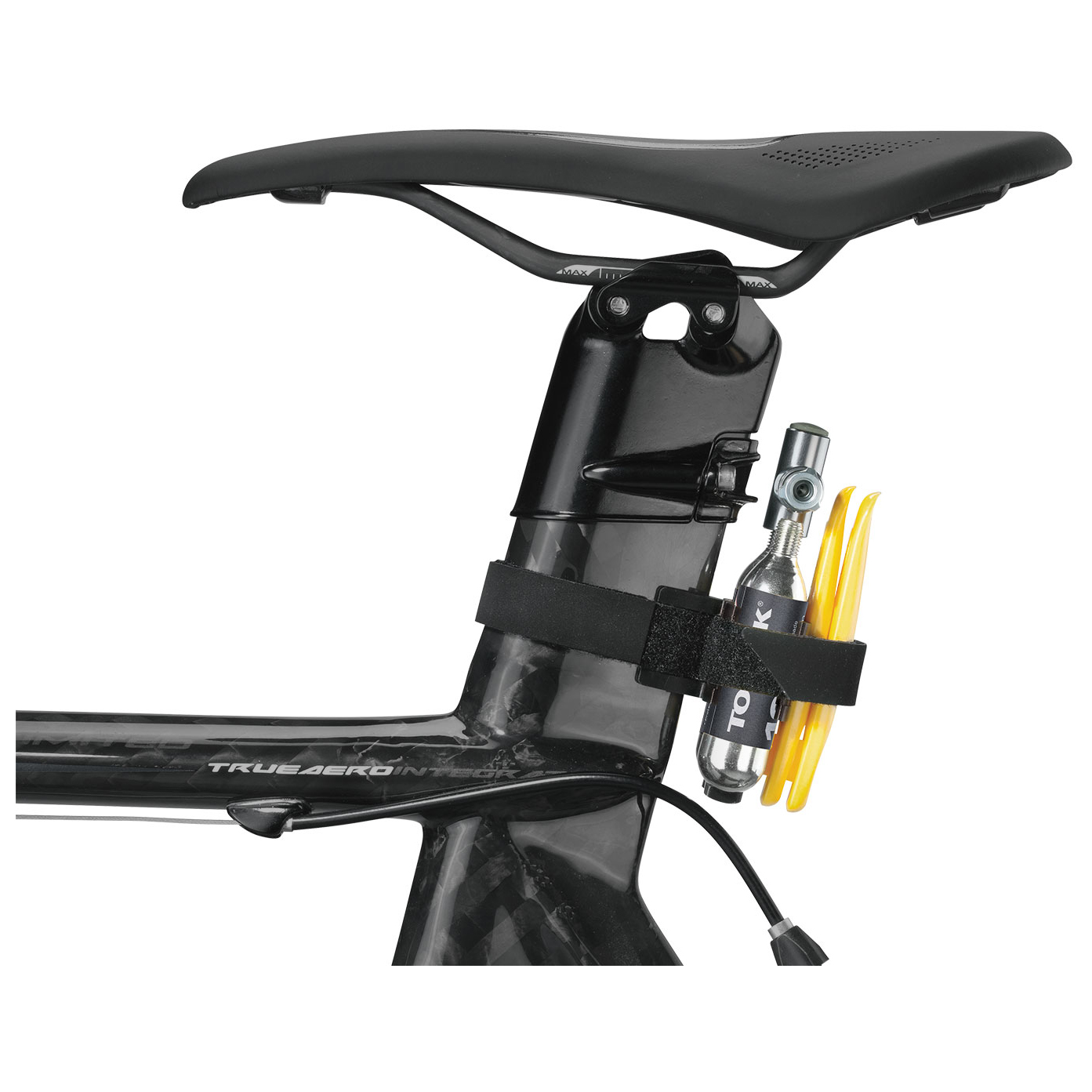 - 2x 16 g CO₂-Gewindekartuschen; Halter für runde und aerodynamisch geformte Sattelstützen; Fach für Reifenheber und CO₂-Gewindekartuschen
